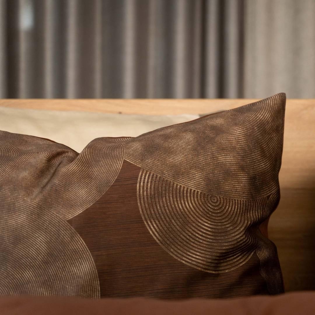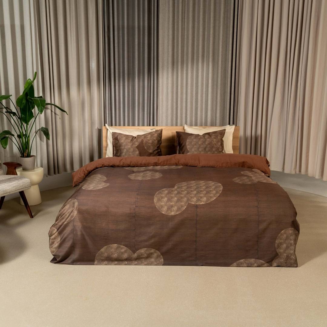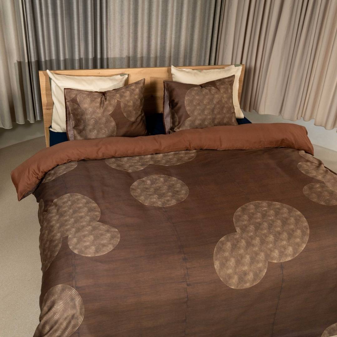 Laat je slaapkamer stralen met het Kayori dekbedovertrek Jiro. De natuurlijke warmte en tijdloze elegantie is een perfecte mix voor ieder interieur. De warme bruine ondergrond wordt speels onderbroken door grote cirkels. De achterzijde is effen bruine waarmee je een strakke en veelzijdige styling krijgt, leuk om mee te variëren bij het opmaken van jouw bed.