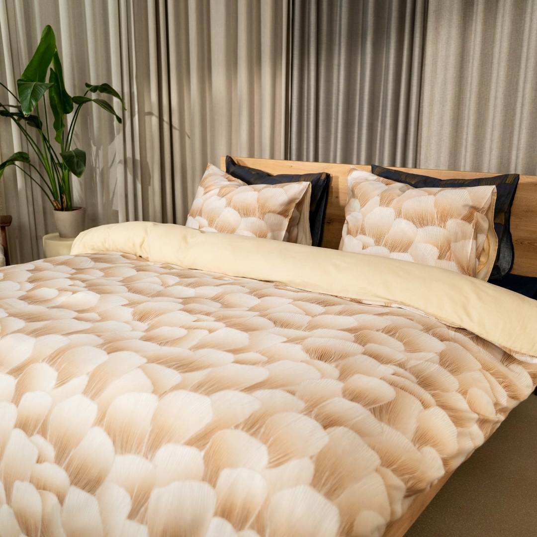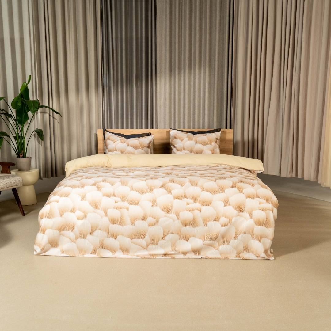 Geef je slaapkamer een luxe en warme uitstraling met het Kayori dekbedovertrek Koji Goud. Het dessin heeft een subtiel geometrisch patroon in gouden kleur dat een rustige sfeer geeft op de beige ondergrond. De vormen lijken op bloemblaadjes of waaiers. De achterzijde is effen goudkleurig waarmee je eenvoudig de slaapkamer kan stylen.
