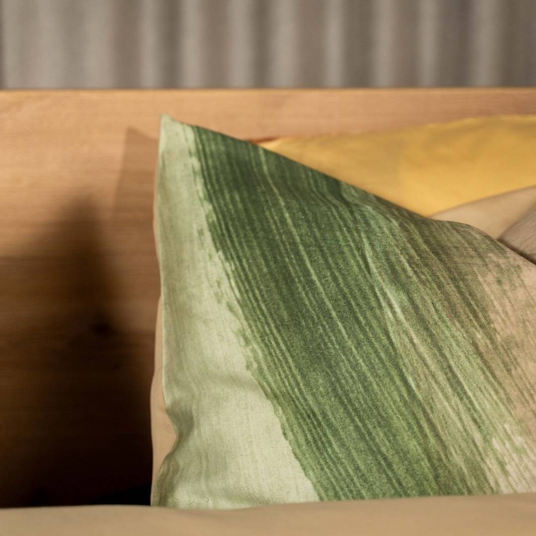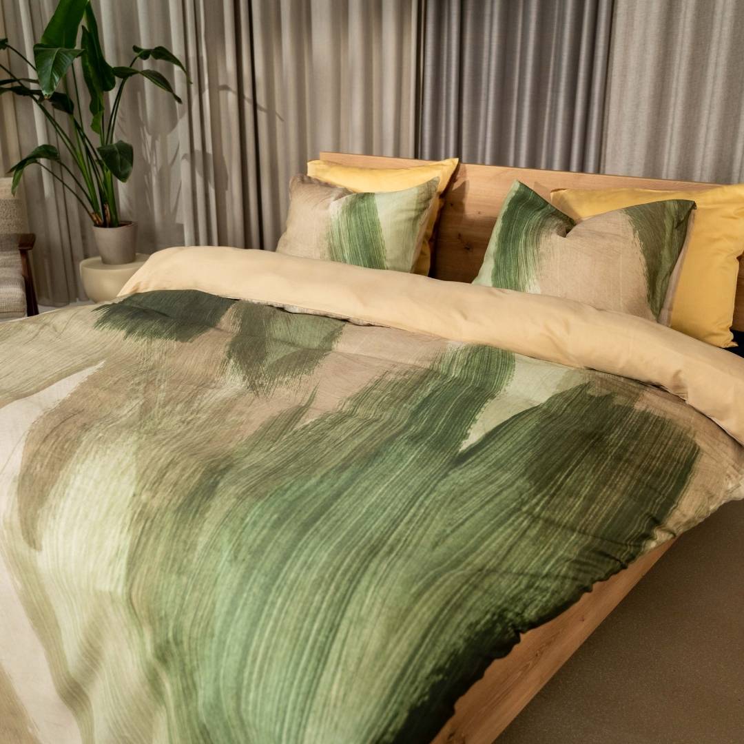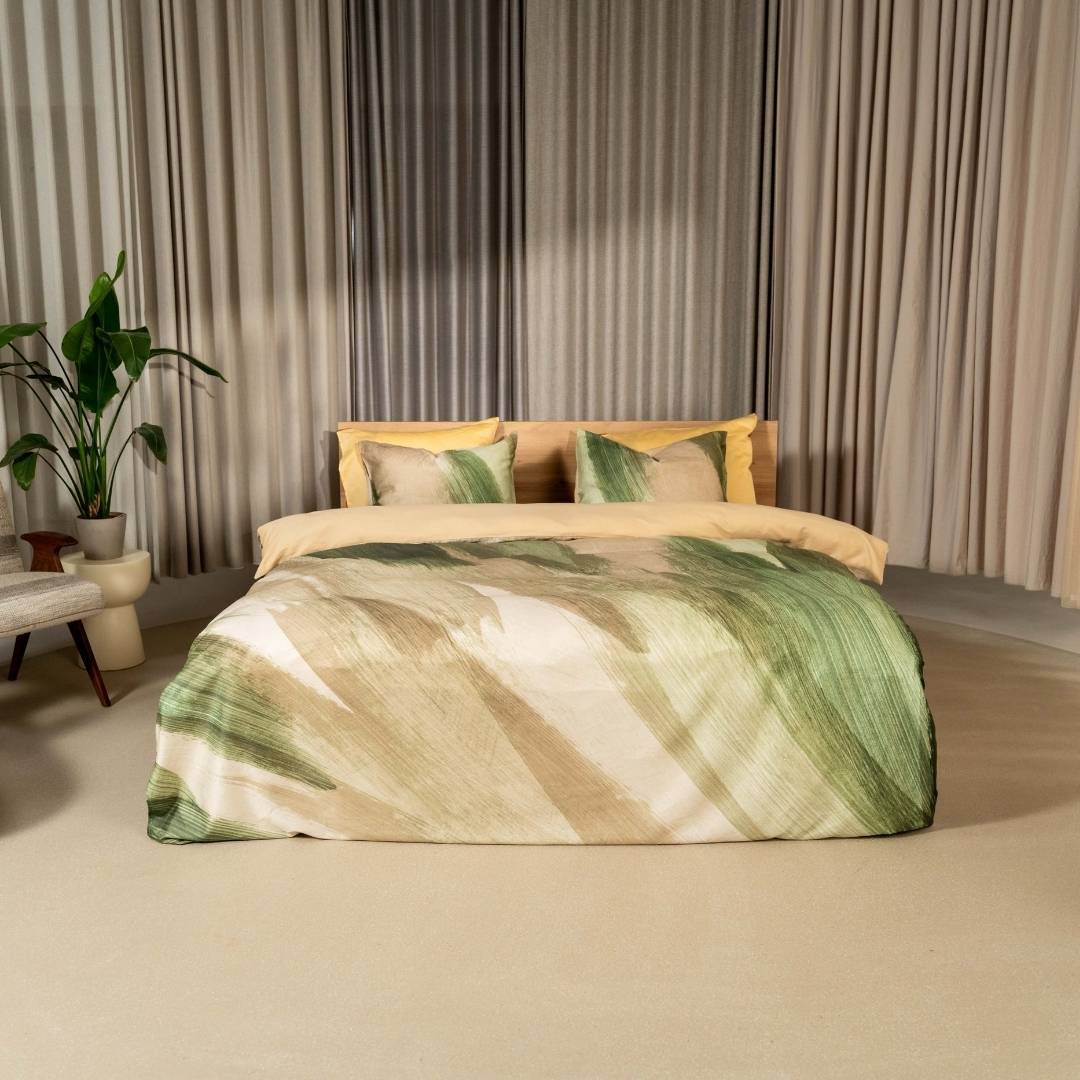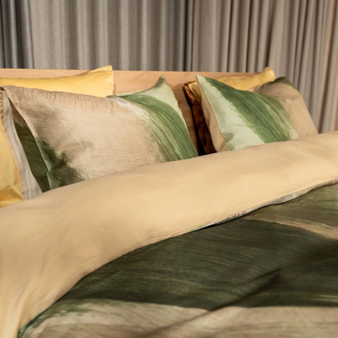 Laat je omhullen met de natuur met het Kayori dekbedovertrek Moriko. Het dessin bevat een handgeschilderde print van penseelstreken in groene en bruine tinten. De vloeiende overgangen zorgen voor een kalme en harmonieuze uitstraling. Een perfect dekbedovertrek voor wie houdt van natuurlijke kleuren en subtiele luxe. De achterzijde is effen naturel waarmee het geheel harmonieus en stijlvol wordt. Ideaal voor een rustige slaapkamer.
