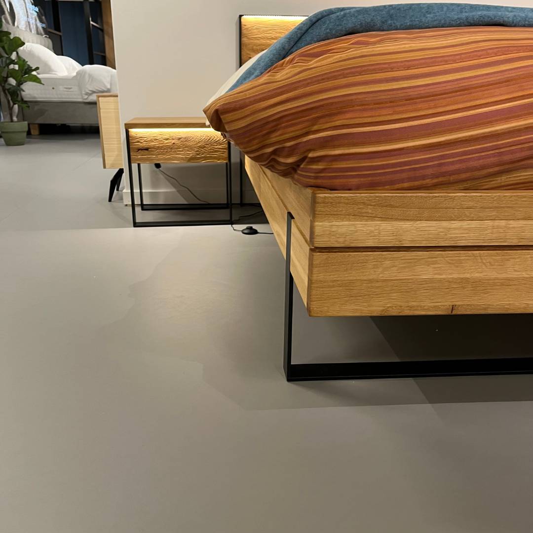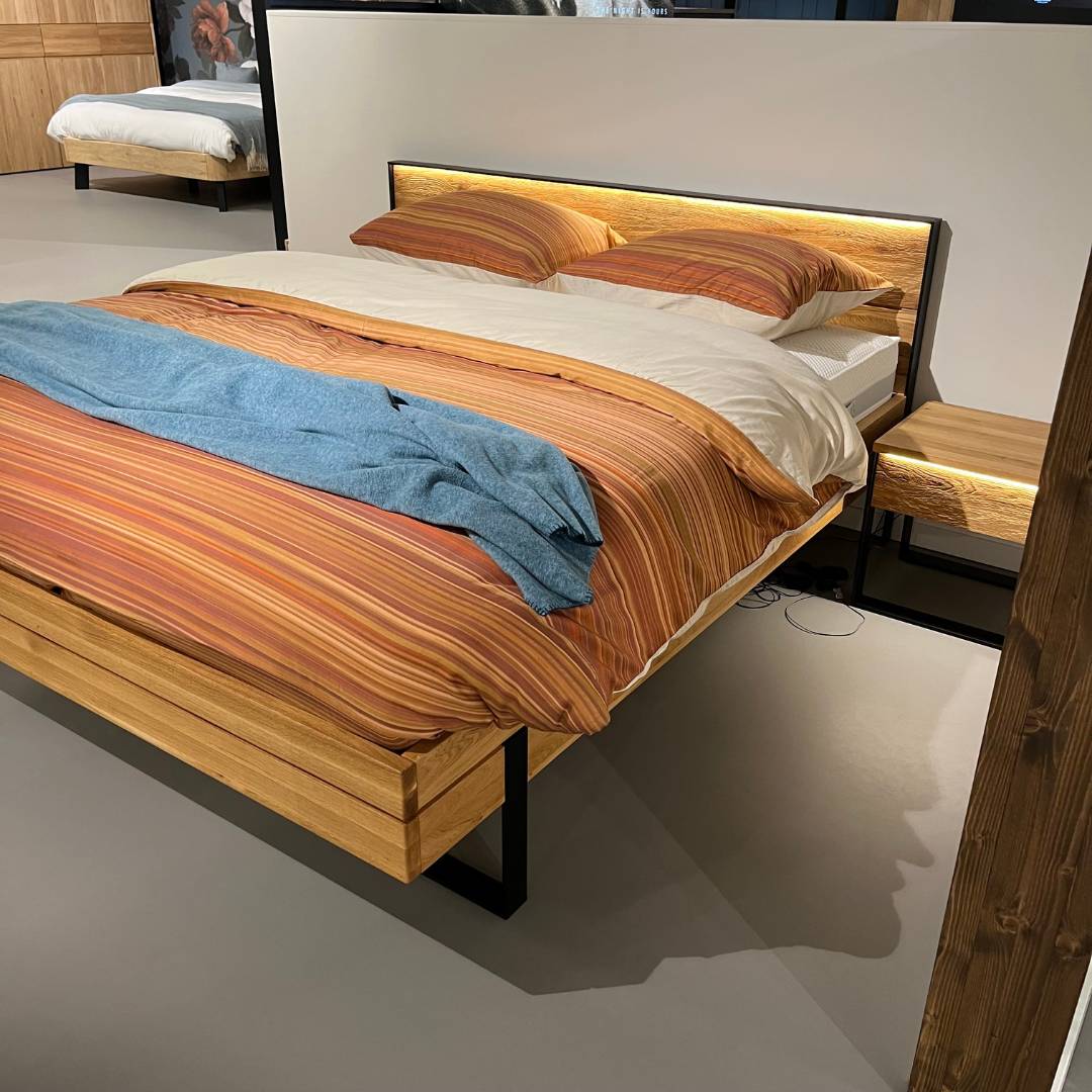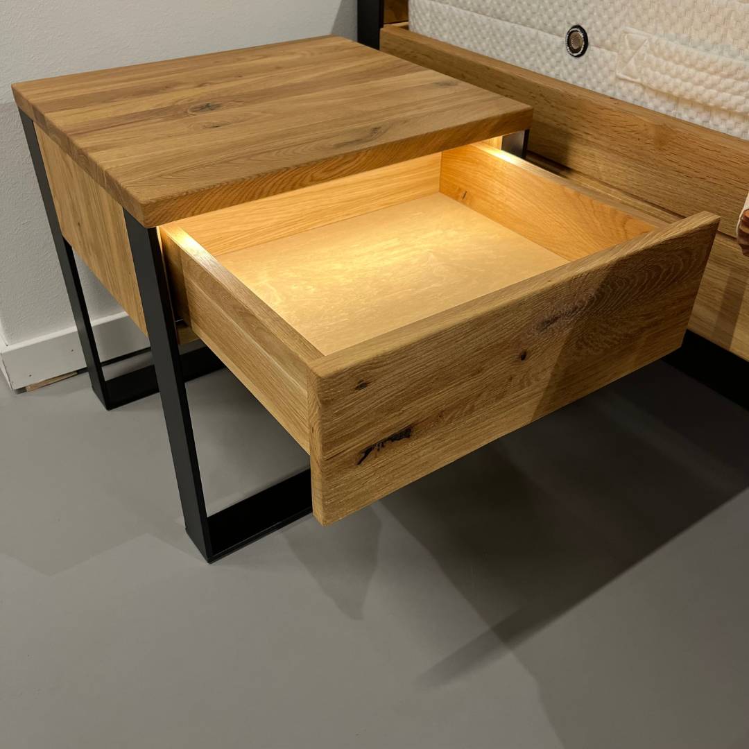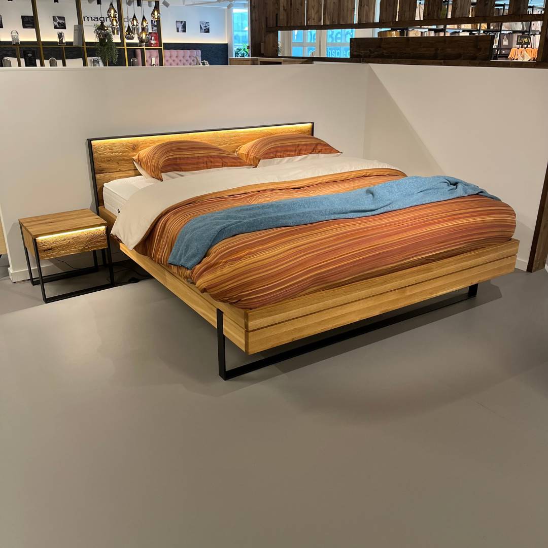 In onze showroom maken wij ruimte voor nieuwe collectie. Daarom bieden wij dit Forestales ledikant Boston nu extre voordelig aan. Het Forestales ledikant Boston is een strak massief houten ledikant. De stalen poot aan het voeteneinde geeft het bed een stoere uitstraling en laat het bed zweven. Het hoofdbord heeft een zwart stalen frame, hierbij is het mogelijk om hier verlichting te plaatsen. Het bijpassende nachtkastje Boston heeft een push to open lade, met daarbij ook verlichting bij de lade.