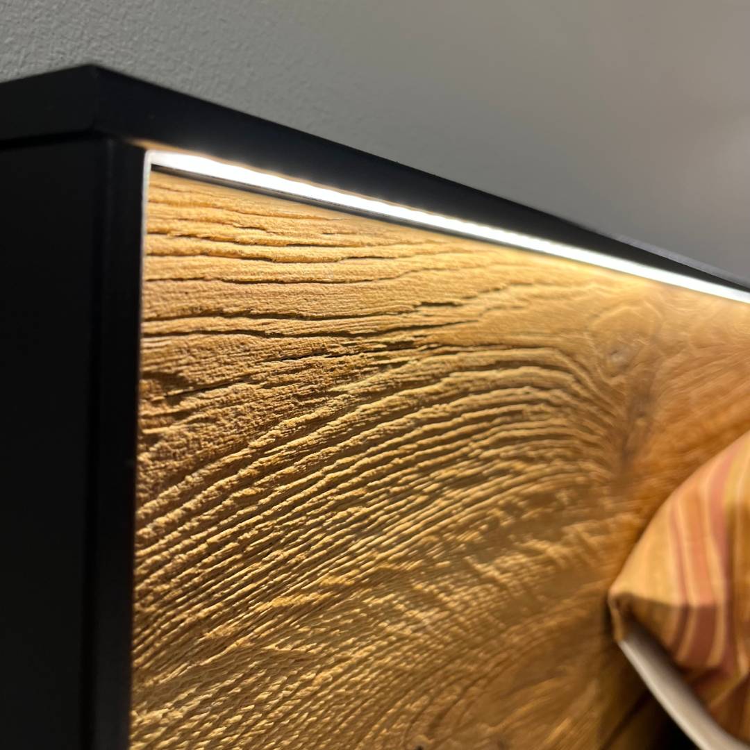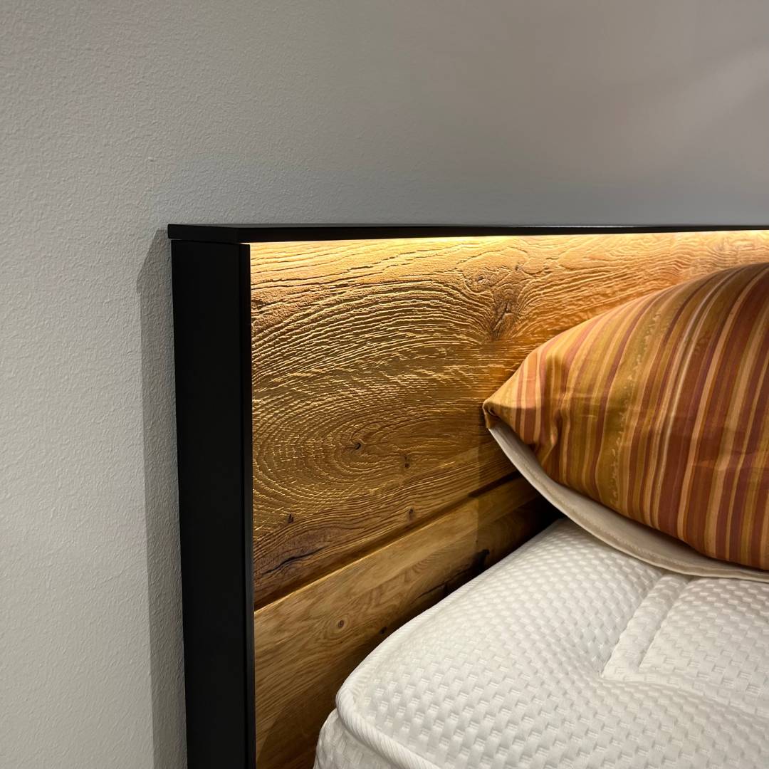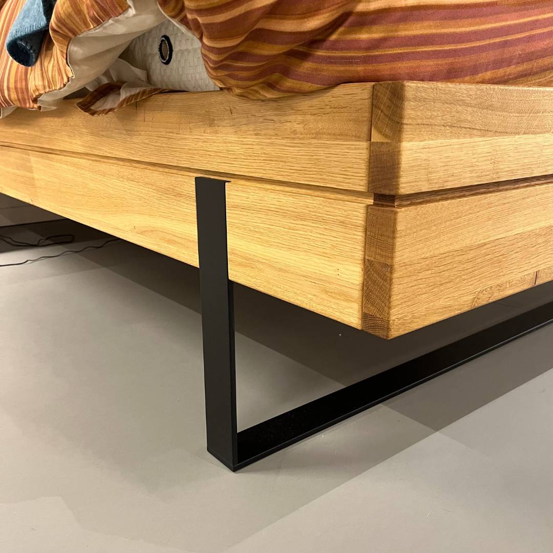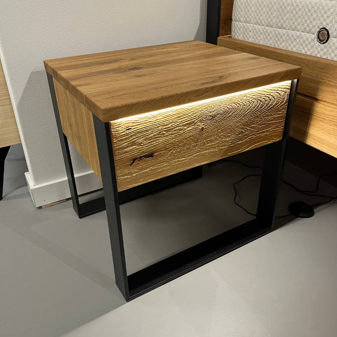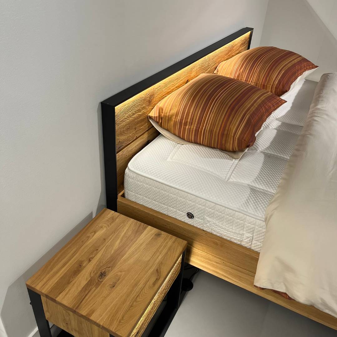 In onze showroom maken wij ruimte voor nieuwe collectie. Daarom bieden wij dit Forestales ledikant Boston nu extre voordelig aan. Het Forestales ledikant Boston is een strak massief houten ledikant. De stalen poot aan het voeteneinde geeft het bed een stoere uitstraling en laat het bed zweven. Het hoofdbord heeft een zwart stalen frame, hierbij is het mogelijk om hier verlichting te plaatsen. Het bijpassende nachtkastje Boston heeft een push to open lade, met daarbij ook verlichting bij de lade.