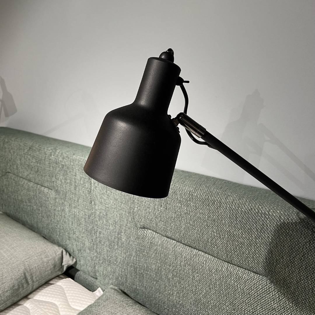 Zwarte lamp, gemonteerd aan zijkant bed