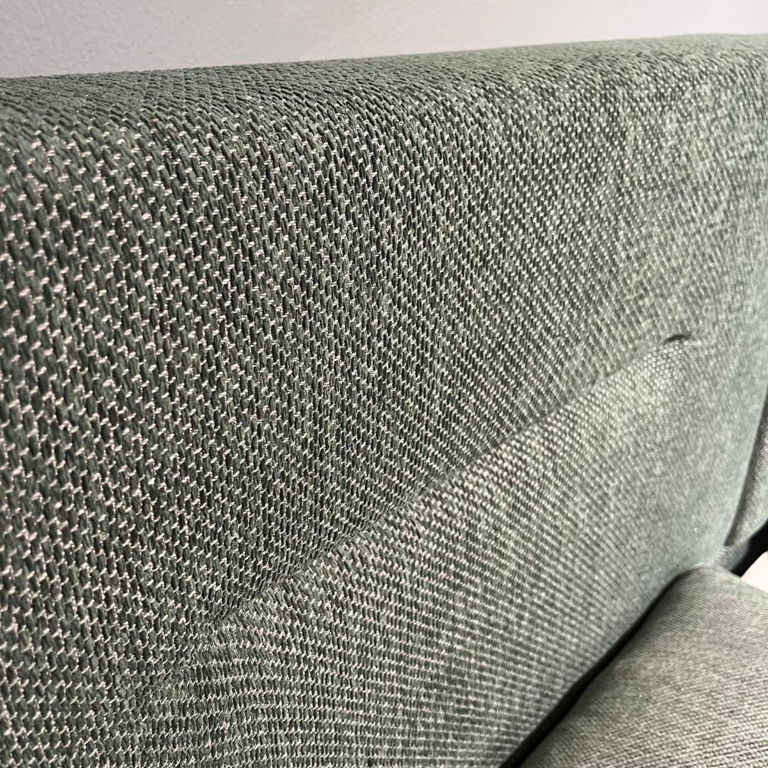 De Jensen Prestige is gestoffeerd in een de Prestige stof 438 Green, het hoofdbord heeft de headbord stof 428 Green. De ronde slanke poot van 14 cm hoog is uitgevoerd in het zwart. De accessoires met hout zijn uitgevoerd in een Whitewash eiken.