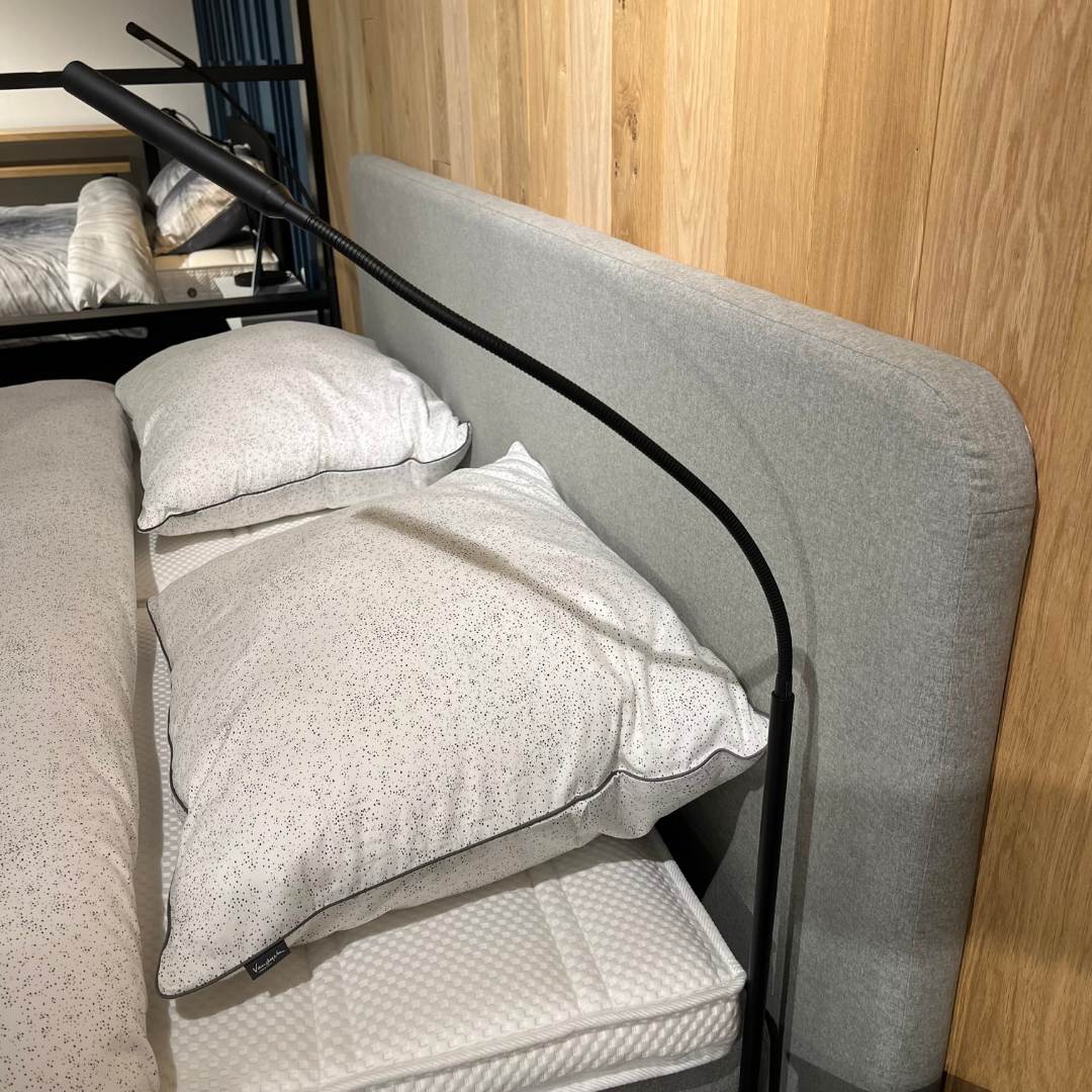 De boxspring en het kussen van de bedbank zijn gestoffeerd in stofgroep Ancora: Lainosa 601. Dit is een grijze kleur. De poten van deze boxspring zijn de 15 cm hoge Axis poten in het zwart.