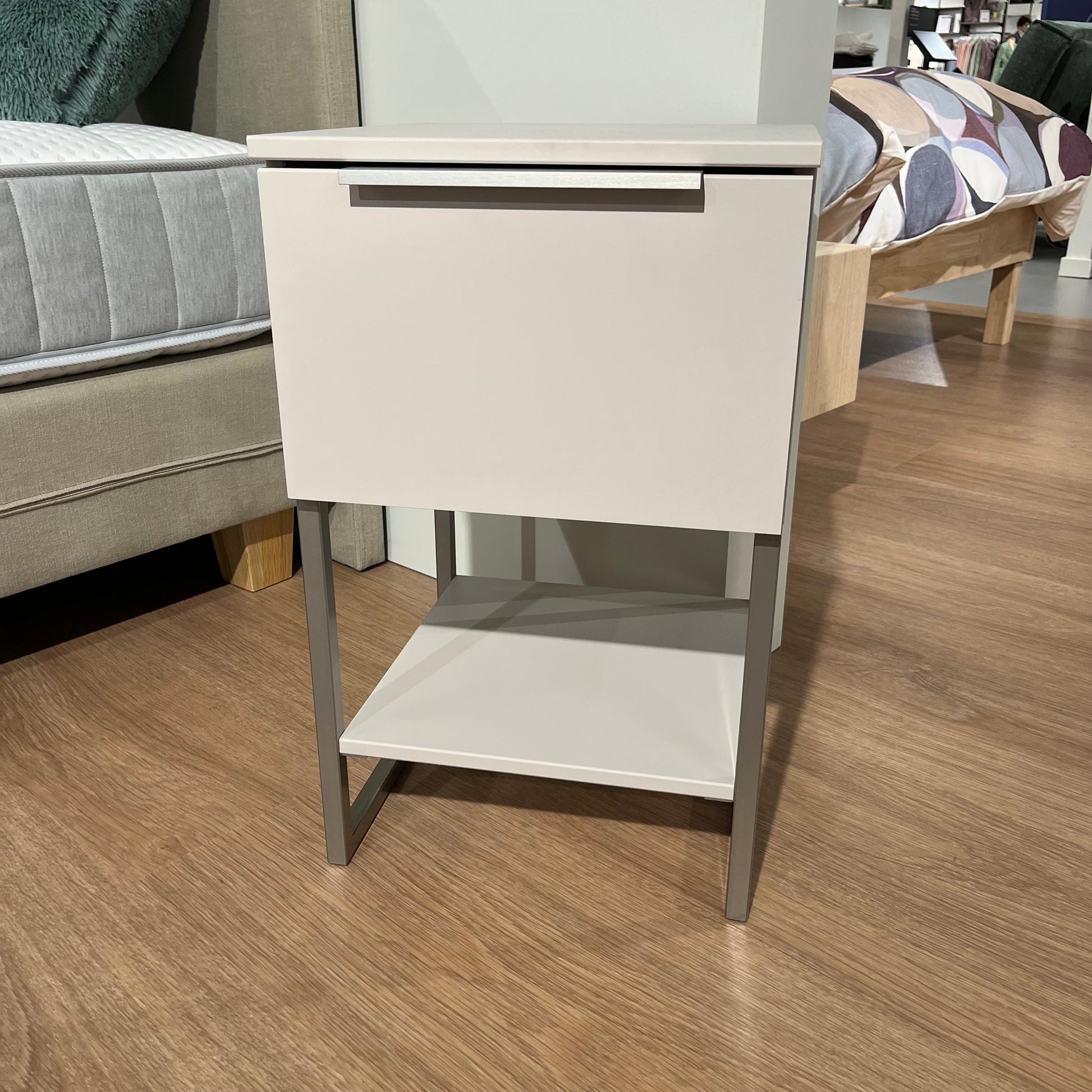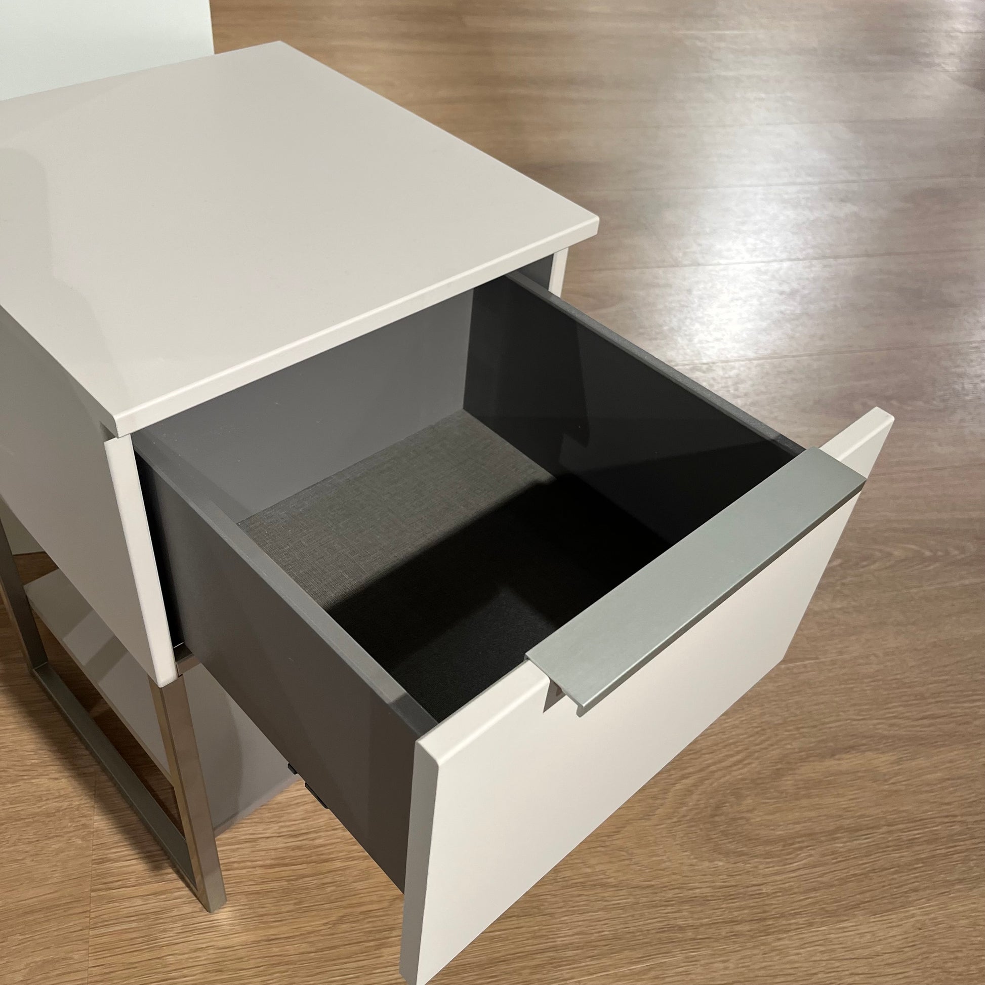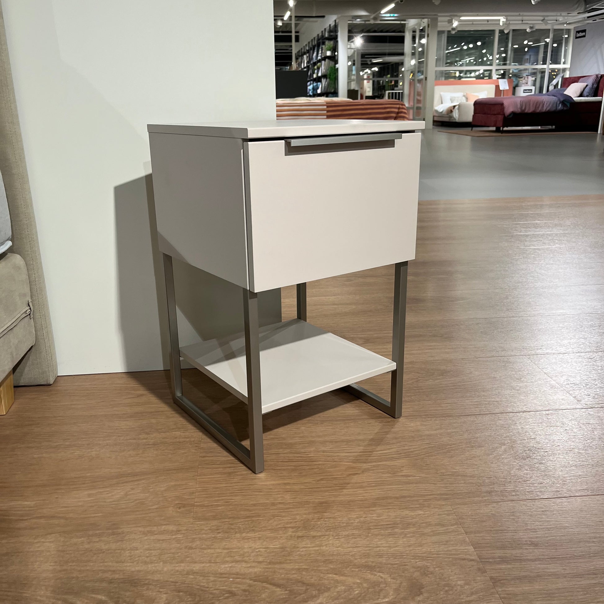 Elegant en verfijnd: dit Nolte Akaro nachtkastje in de kleur Perla heeft een stijlvol geborsteld stalen frame en een subtiele afgeschuinde greep. De ingetogen kleurstelling en strakke vormgeving maken dit kastje een tijdloze toevoeging aan iedere slaapkamer.