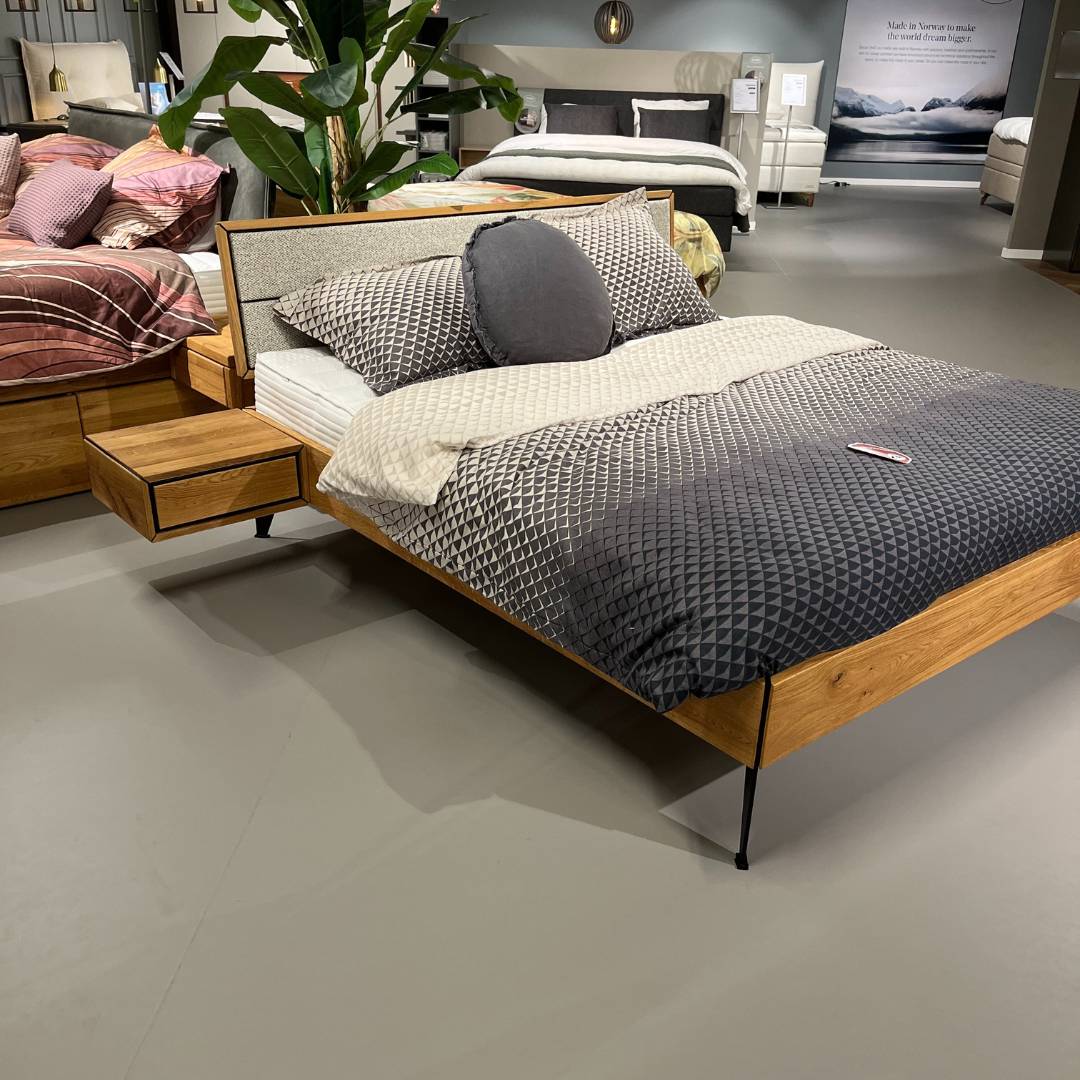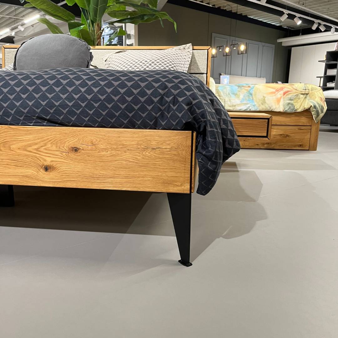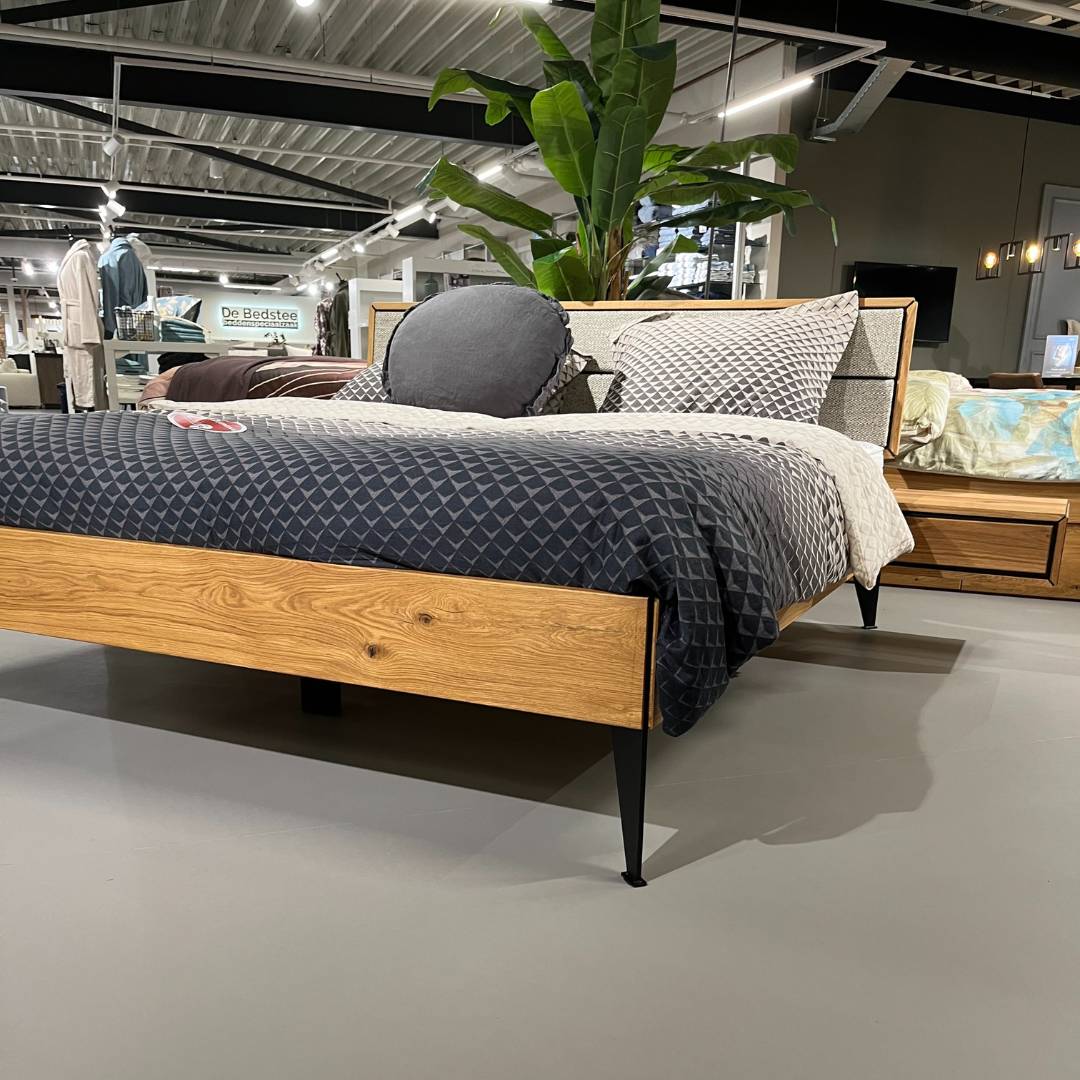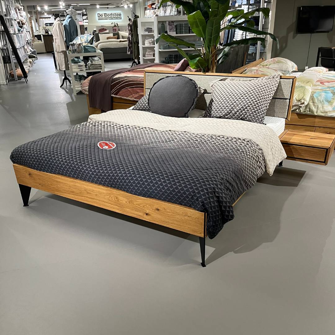 In onze showroom maken wij ruimte voor nieuwe bedden. Om die reden bieden wij het Tjornbo ledikant Frederik nu extra voordelig aan. De Frederik is een eiken ledikant met tussen de zijden een strakke zwarte poot. Het gestoffeerde hoofdbord is omkaderd met het eiken hout. Zo worden het hoofdbord en bed een geheel. De nachtkastjes worden zwevend gemonteerd aan de bedzijden. Ook hierin zie je met de zwarte rand om de lade heen. Het ledikant Frederik is een combinatie tussen stoere zwarte details en een warme eiken uitstraling.