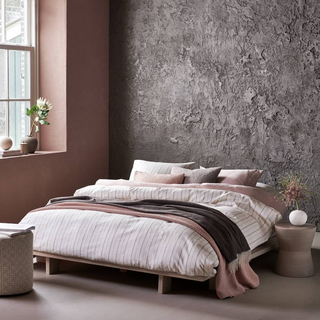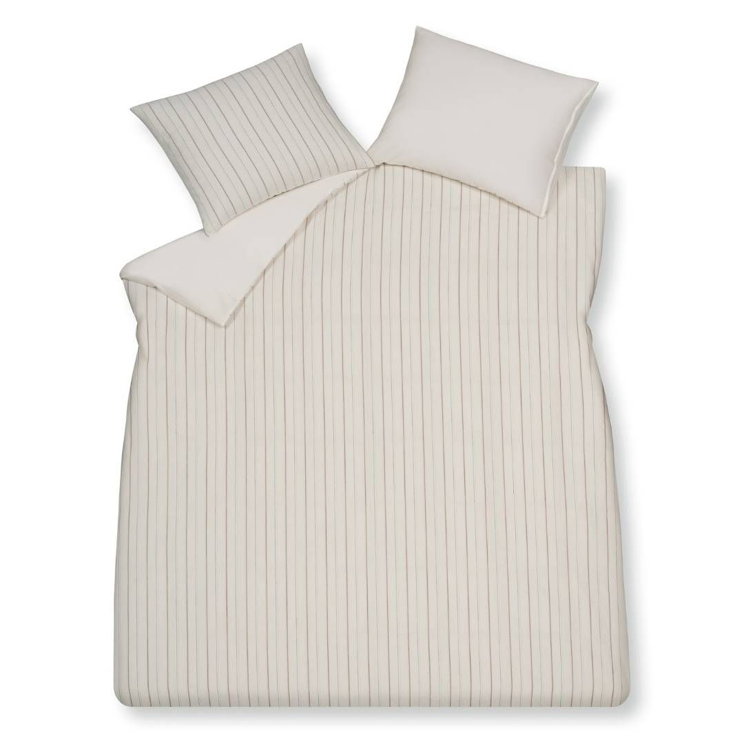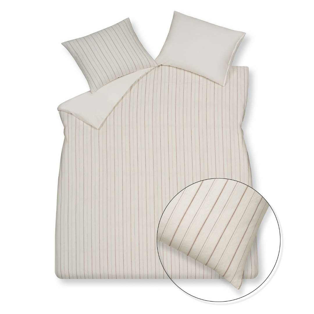Het dekbedovertrek Pure 97 Offwhite van Vandyck heeft een geweven strependessin. De fijne strepen strepen die verticaal over het overtrek heen lopen zijn bruine en roze draden die goed uitkomen op de offwhite ondergrond. Het dessin van de lijnen is fijn, wat het een speelse en zachte uitstraling geeft. De achterzijde van dit overtrek is effen, hiermee kan spelen door het hoofdeinde wel of niet om te slaan. Het overtrek is gemaakt van een combinatie van linnen en katoen. Dit zorgt voor een stoere look en een fijn slaapcomfort door de ademende eigenschappen. De achterzijde is een 300 threadcount katoensatijn voor een extra soepel en comfortabel ligcomfort. Combineer het overtrek met een van de prachtige plaids uit de Vandyck Collectie.