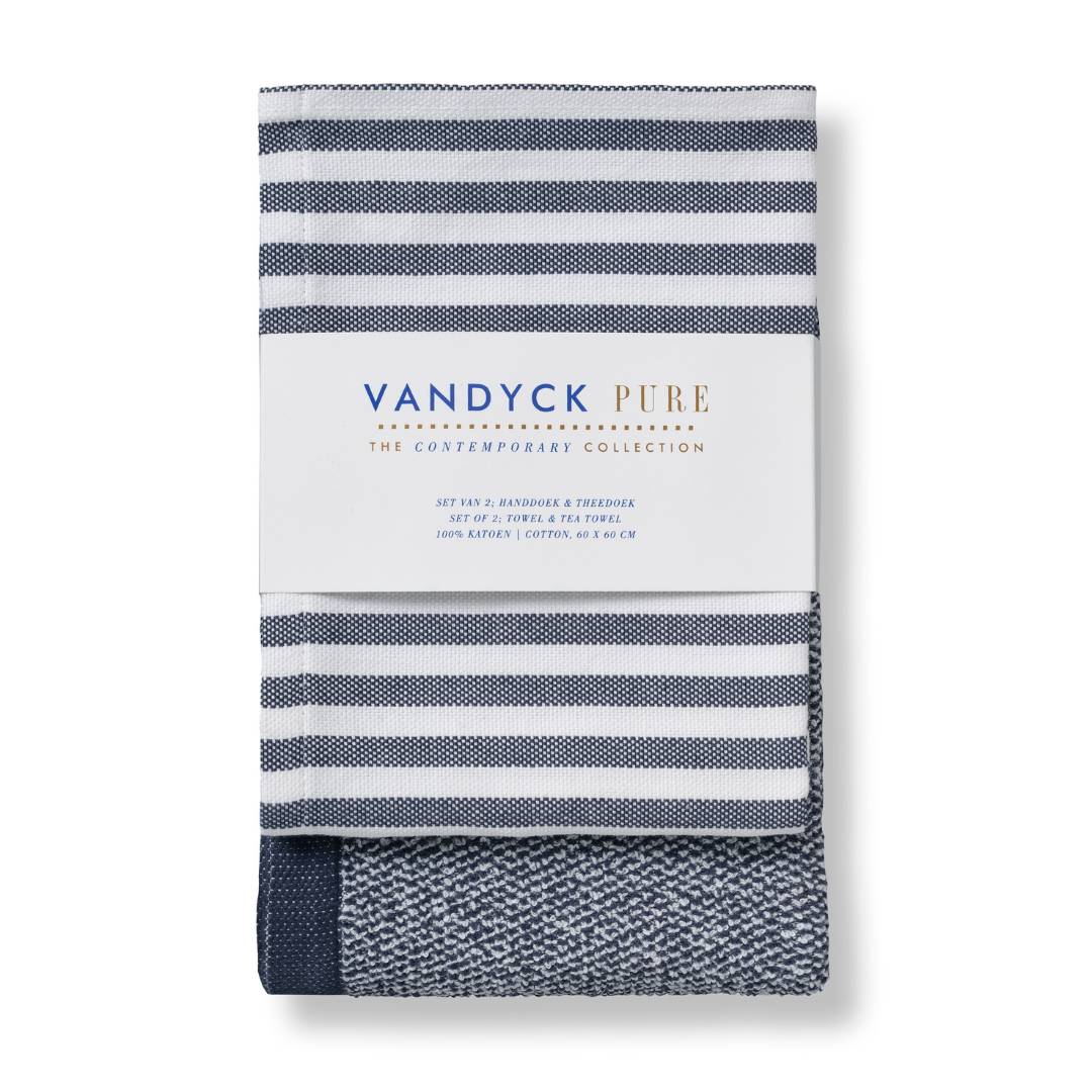 Het Vandyck Pure Kitchen Blue Ink keukengoed is een ideale en kleurrijke toevoeging in de keuken. De set bestaat uit een handdoek en een theedoek, ideaal dus om alles mee droog te maken in de keuken. De theedoek heeft een streepdessin, terwijl de handdoek een moulinedessin heeft. De hand- en theedoek zijn gemaakt van 100% katoen, daarmee krijgt het een uitstekend absorptievermogen.